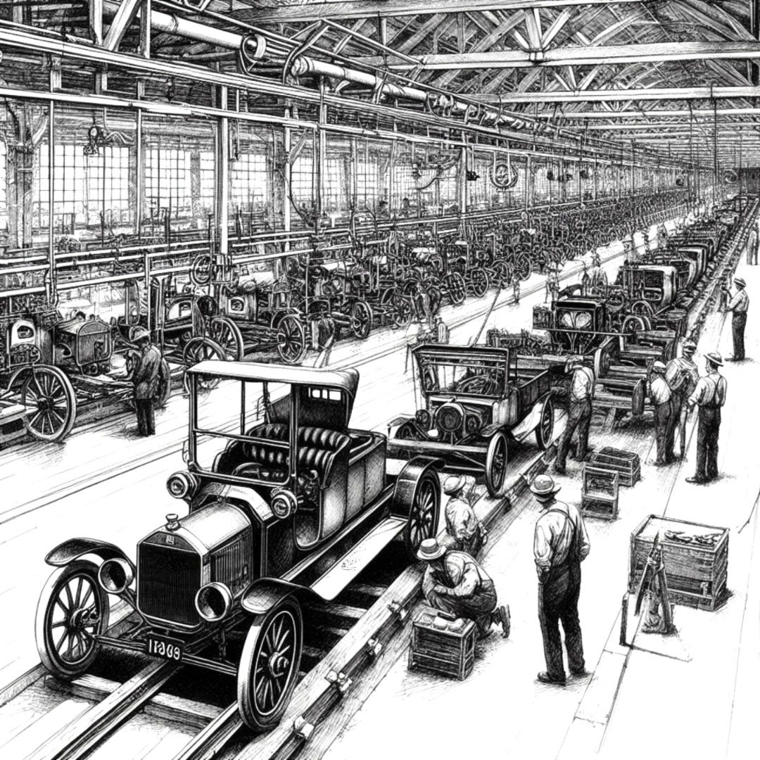 Pulling that off required what was perhaps his most important invention: the assembly line. It had its genesis in an idea some of his employees came up with — to build magnetos (the electric generator that sends current to the spark plugs) by having each worker add just a couple of parts and push the magneto down the line to the next guy.
